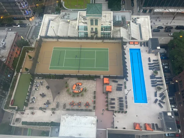 Gorgeous, updated condo featuring an open-concept layout with custom kitchen cabinetry, granite countertops, a breakfast bar, and stainless-steel appliances including a KitchenAid refrigerator and range, Bosch dishwasher, and NEST thermostat, plus in-unit washer/dryer. The generous living area features a distinctive curved wall with large windows and a separate dining space. The bedroom comfortably accommodates a king-sized bed. Enjoy stunning city and river views from inside the home and on the private balcony, all in the heart of River North. The Sterling is a full-amenity building offering 24-hour door staff, on-site management and engineering, a fitness center, outdoor lap pool, tennis court, and a recently renovated sundeck with grills and a fire pit. Cable and high-speed internet are included. A truly walkable location with an array of nearby restaurants, shopping, and entertainment options-including Chicago Cut Steakhouse, Frontera Grill, Harry Caray's, Jewel-Osco, and Trader Joe's-with easy access to the CTA. Monthly garage parking is available.