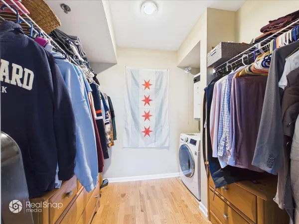 Rare 31st-floor corner unit with sweeping city and river views! So many windows provides exceptional natural light and a bright, open layout. Features include wood laminate floors throughout, in-unit washer/dryer, elegant French doors to the bedroom, and a private balcony perfect for enjoying the skyline. Full-size floor plan feels larger and more refined than typical one-bedrooms. Full-amenity, pet-friendly building offers 24-hour door staff, on-site management and engineer, two fitness centers, tennis court, outdoor lap pool, sundeck with grills and firepit, and dog run. On-site dry cleaner, pharmacy, and convenience store add everyday ease. Low monthly assessment includes heat, A/C, cable, internet, water, storage, and all amenities - exceptional value in River North. Parking available on site (rental only).